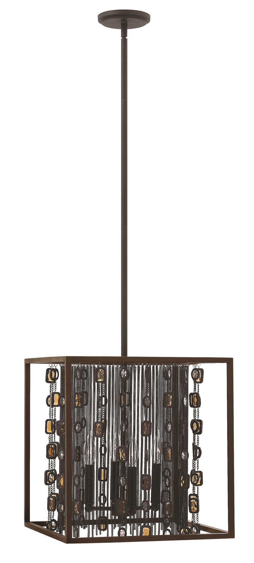 Mercato�s modern silhouette demands attention with a stunning stem hung open frame in Anchor Bronze. Tiers of richly hued amber and clear crystals are suspended from within by fine jeweler�s chain, made more dramatic in deep bronze.