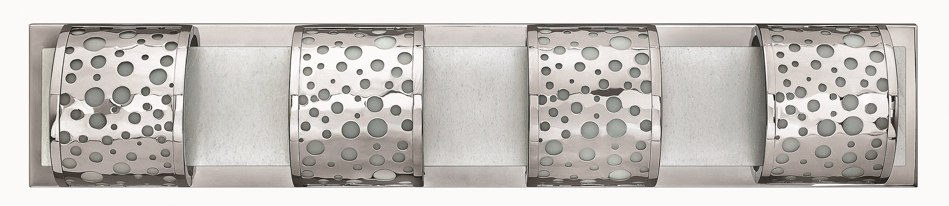 Mira �fizz� is a sleek design in a brilliant Polished Chrome finish featuring laser cut metal half round shades in a bubble pattern lined with etched glass and a raceway back plate accented with an etched seedy glass face plate