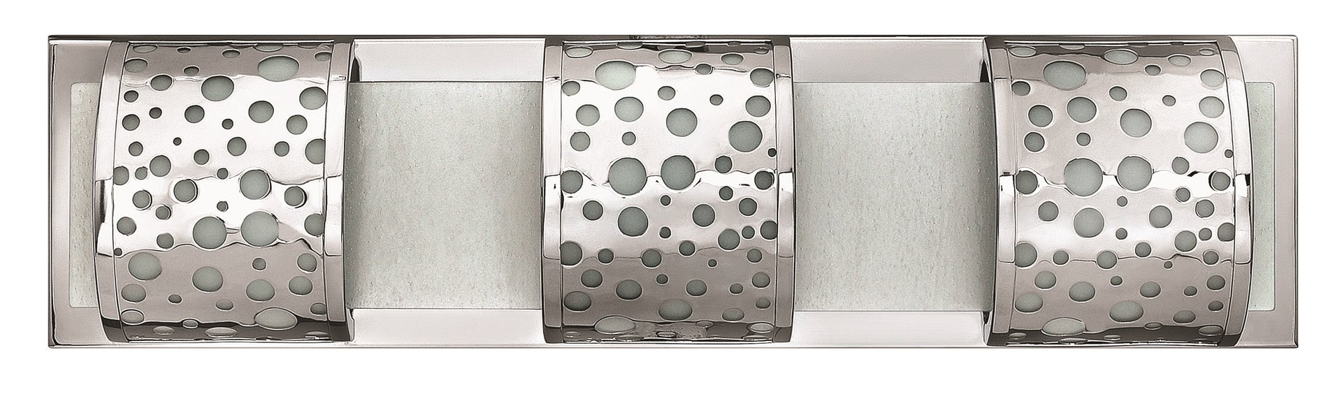 Mira �fizz� is a sleek design in a brilliant Polished Chrome finish featuring laser cut metal half round shades in a bubble pattern lined with etched glass and a raceway back plate accented with an etched seedy glass face plate