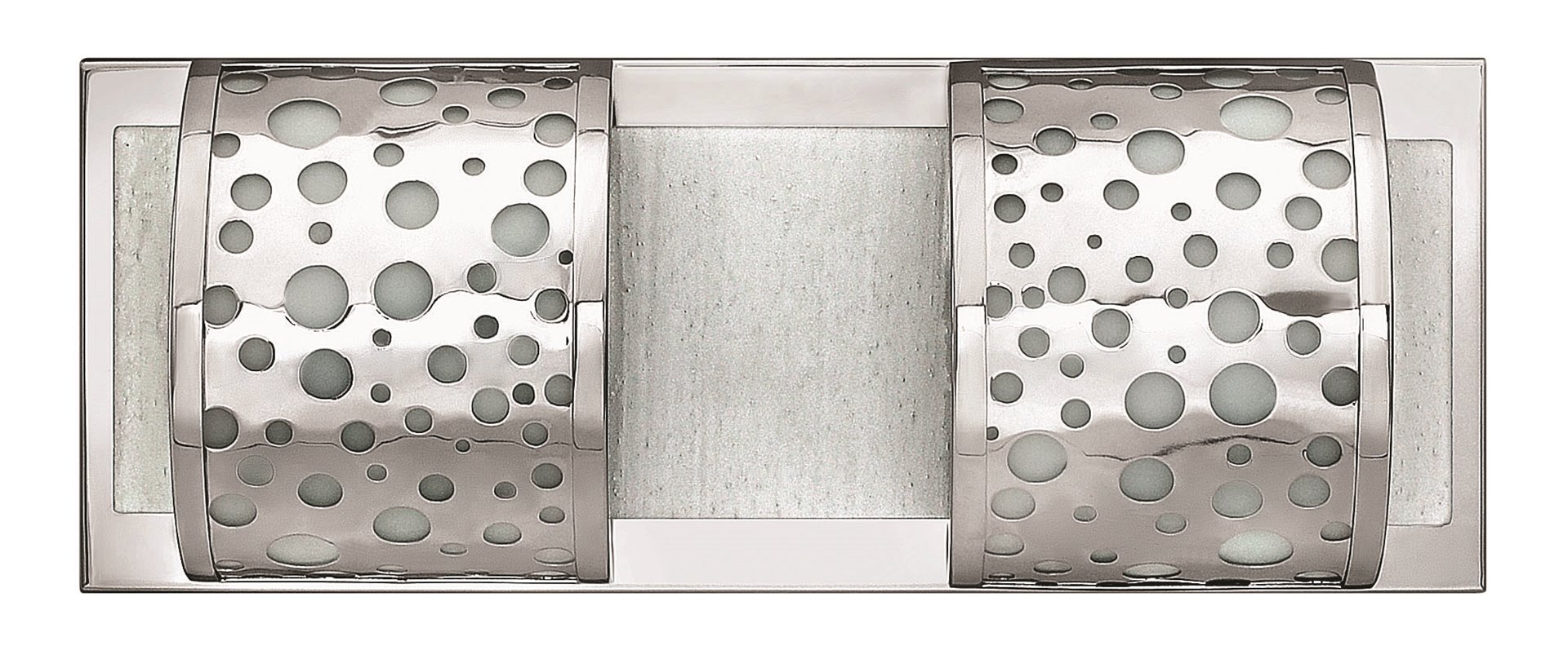 Mira �fizz� is a sleek design in a brilliant Polished Chrome finish featuring laser cut metal half round shades in a bubble pattern lined with etched glass and a raceway back plate accented with an etched seedy glass face plate