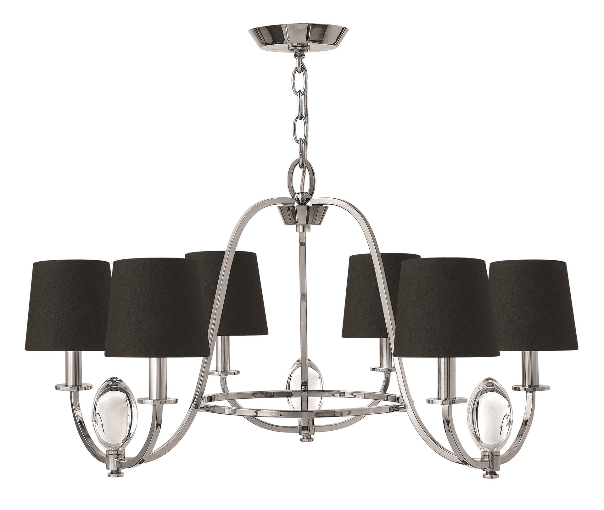 Marielle is a transitional design that blends equal parts luxury and glamour. Graceful arms in a chic Chrome finish sweep outward to create an opulent yet airy feel. Each arm supports two light sources covered by rich black silk, gold lined shades for refined drama.