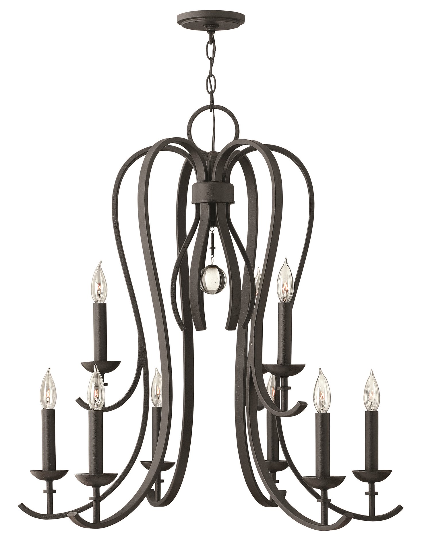 Marions sweeping arms are styled in a minimalist forged iron design and flow dramatically downward to the finished candle sleeves. The open middle features a large glass sphere hanging from its decorative stem.