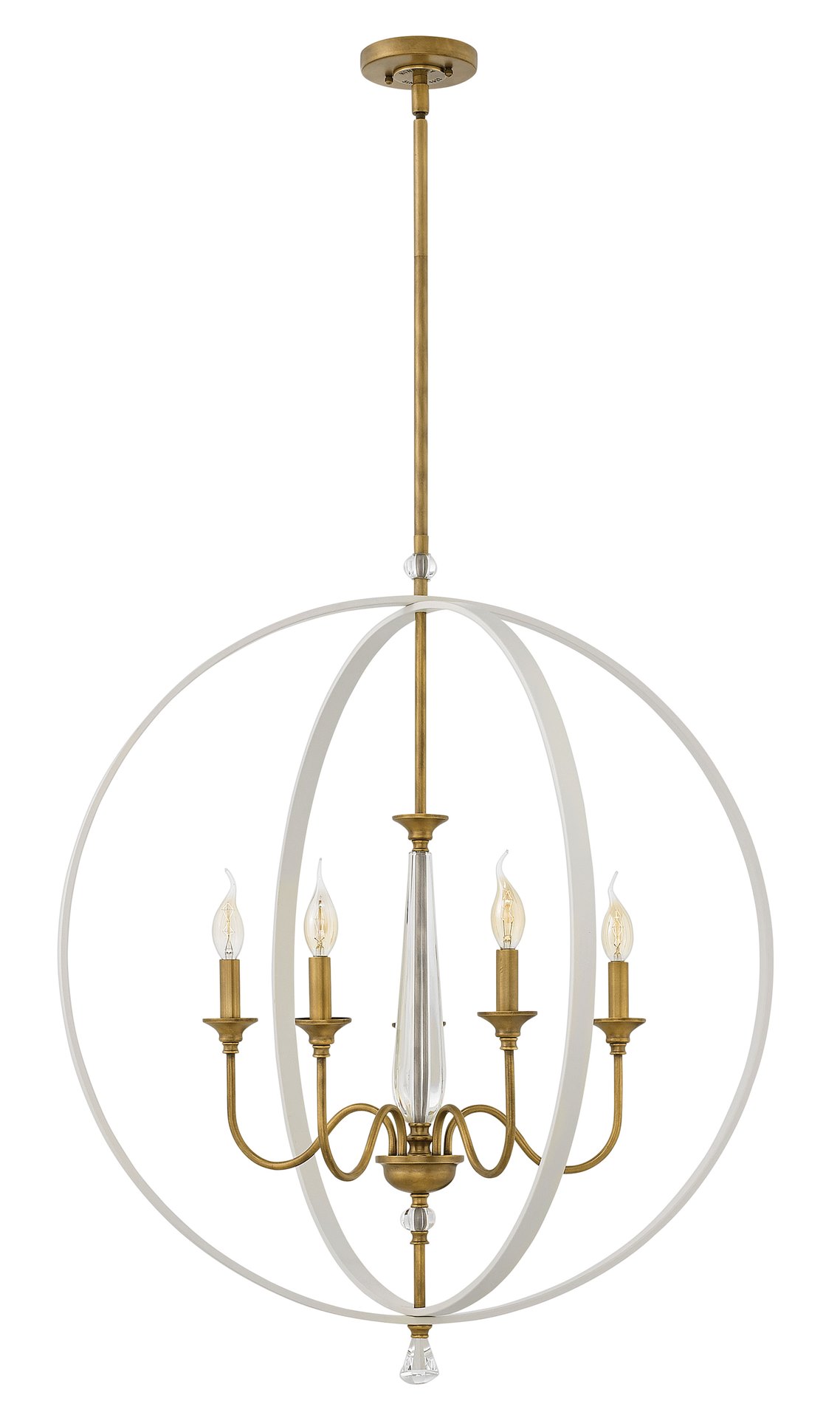 Waverly is a modern update to the classical orb chandelier. A center crystal column anchors this stem-hung design while charming crystal accents and finials complement the clean lines of the intersecting spheres in a bold finish. Light beige fabric shades provide an updated elegance, complementing the overall spherical form. Waverly imparts a sense of European sophistication paired with American sensibility.
