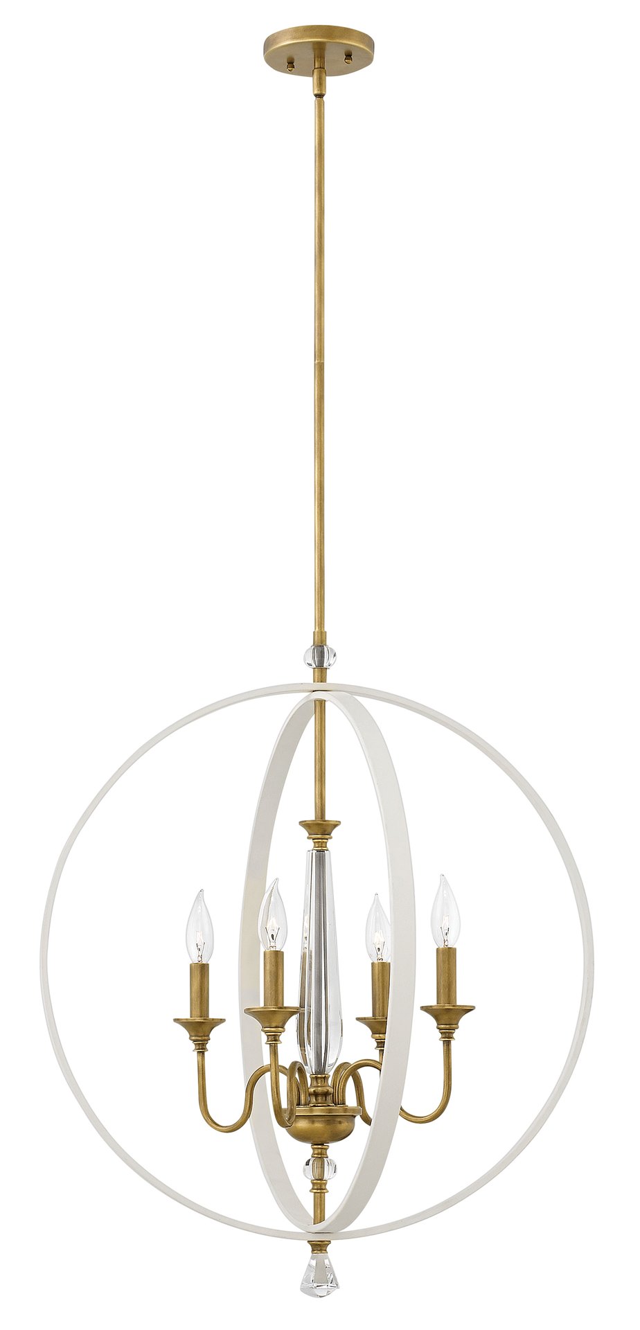 Waverly is a modern update to the classical orb chandelier. A center crystal column anchors this stem-hung design while charming crystal accents and finials complement the clean lines of the intersecting spheres in a bold finish. Light beige fabric shades provide an updated elegance, complementing the overall spherical form. Waverly imparts a sense of European sophistication paired with American sensibility.
