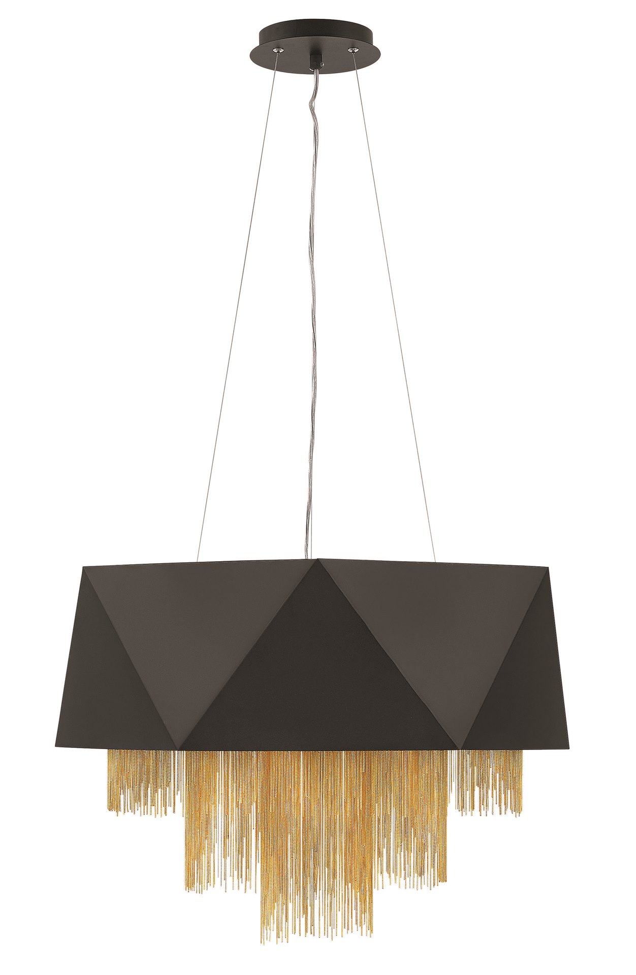 Sculptural and exotic, Zuma tantalizes with a purely contemporary form. The over-scaled geometric pendant in Warm White or Satin Black is softened with layers of fine gold jewelers� chain flowing from its epicenter.