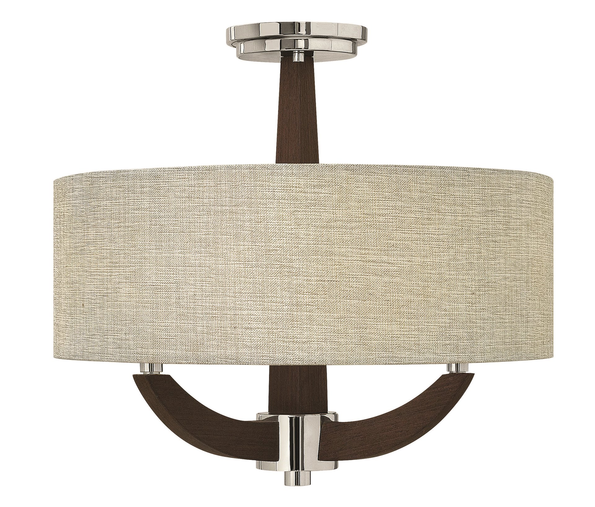 Camerons transitional design features strong modern arms of a rich dark solid wood veneer. The stem hung collection has a bold tapered four sided center column detailed by crisp chrome accents. Elegant textured fabric shades in silver tones add feminine sophistication.