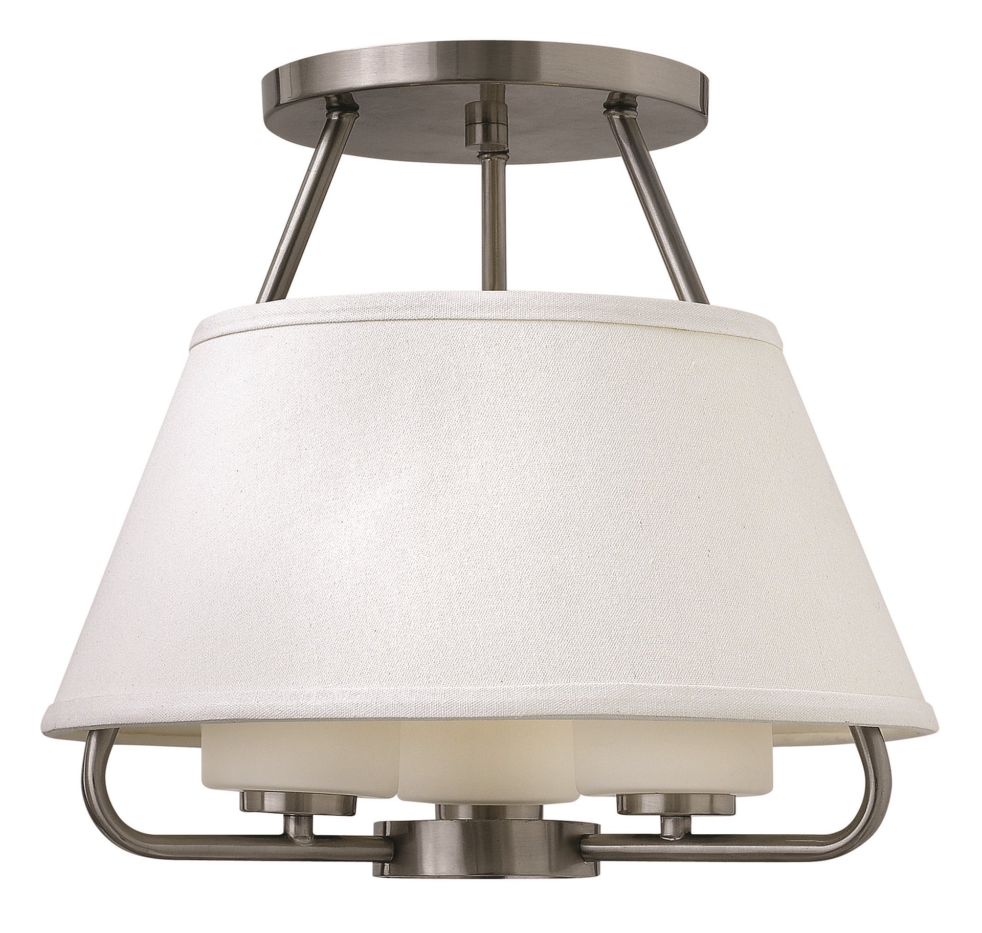 Cole�s soft contemporary silhouette centers on its clean form. An open center ring, softly rounded Brushed Nickel frame, conical white linen drum shade and circular interior etched opal glass shades come together to create a subtlety modern style that complements a variety of interiors.