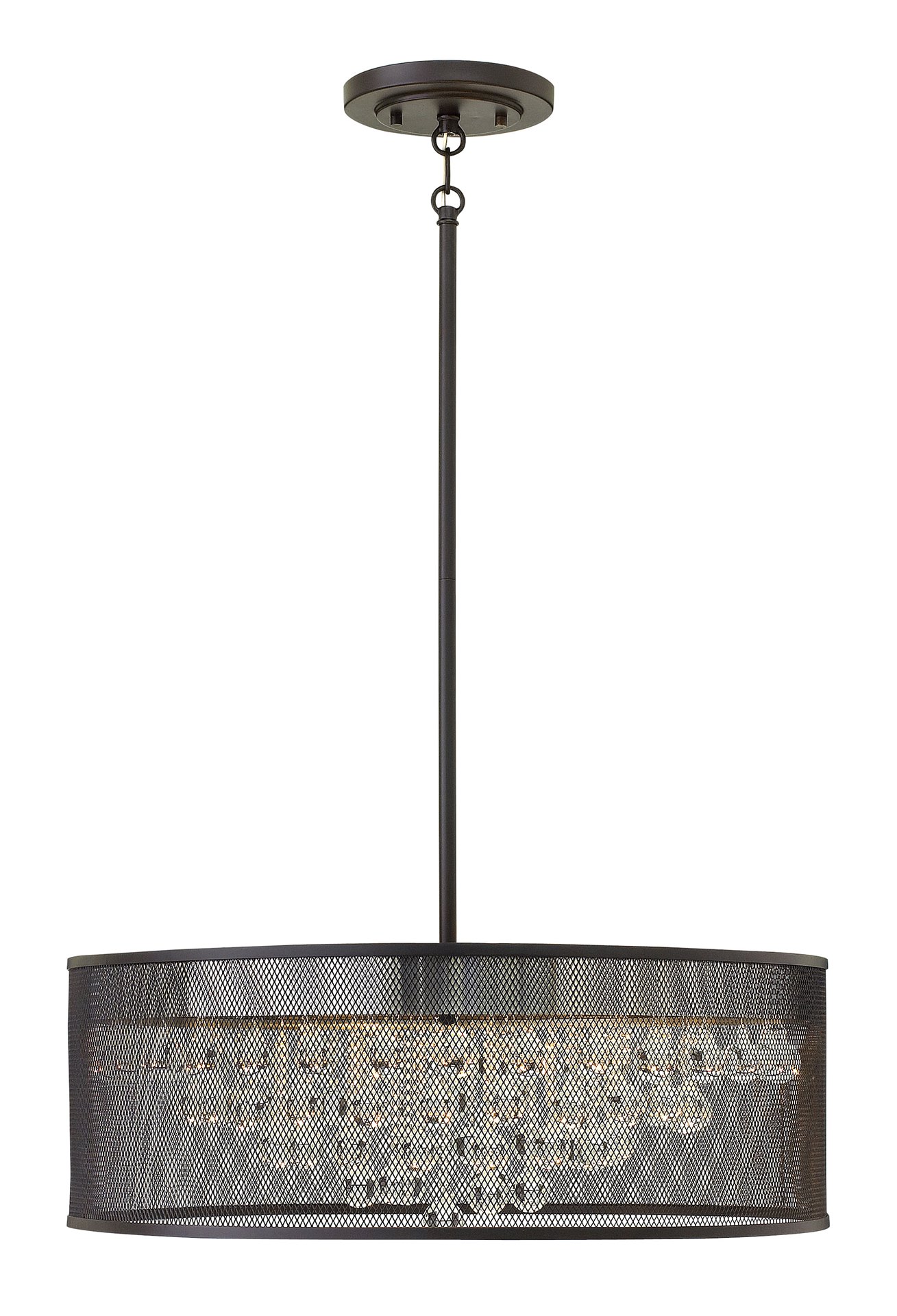 Fiona features a sleek industrial Black mesh outer drum shade encircling tiered glass spheres for the ultimate pairing of industrial-chic design details.