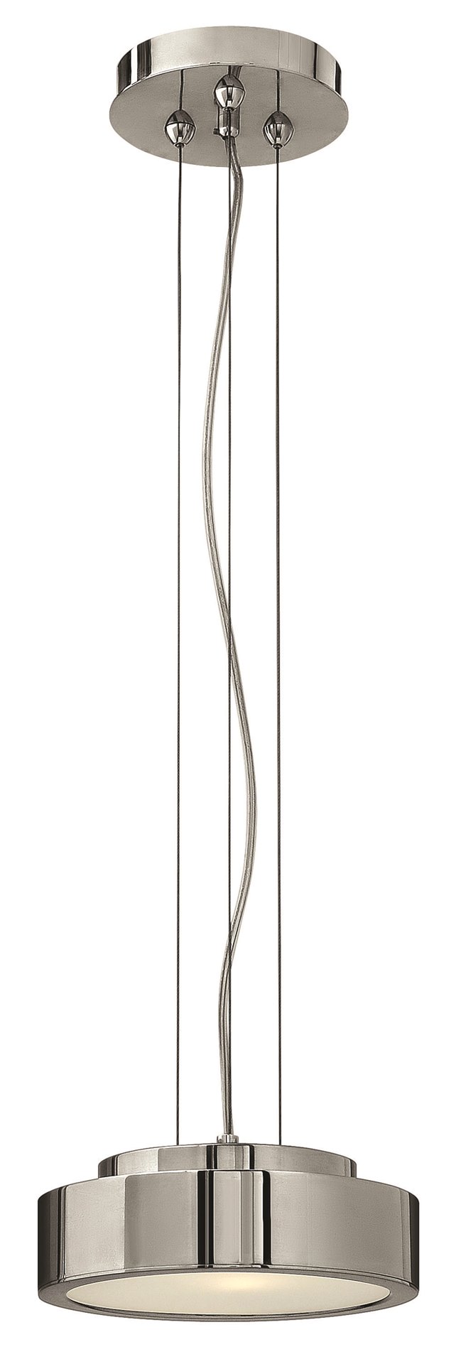 The sleek contemporary cable hung Broadway pendant in a Polished Aluminum finish features a low-profile circular light pod with etched glass diffuser. A detailed mesh uplight diffuser adds sophistication to this chic design.