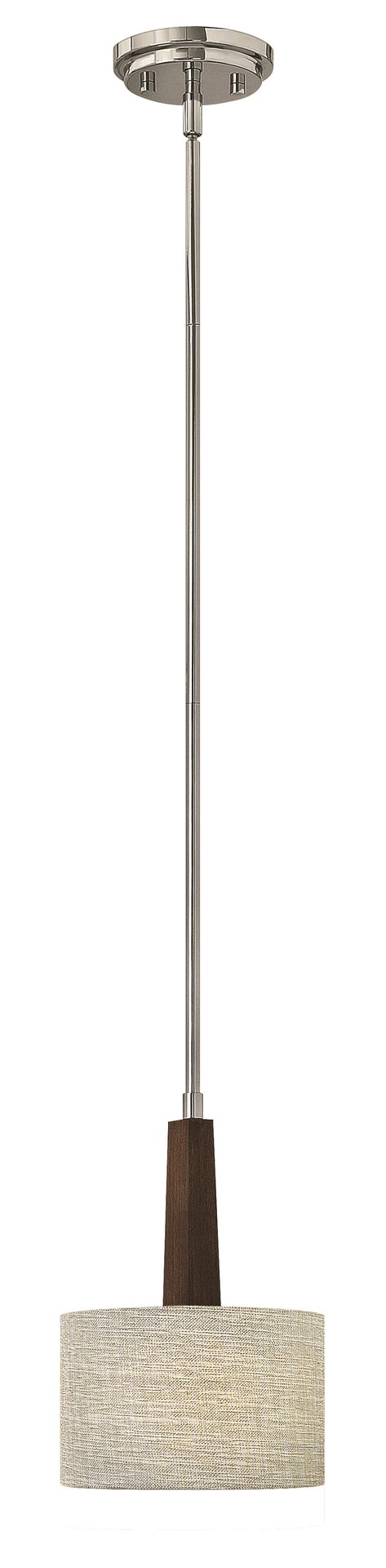 Camerons transitional design features strong modern arms of a rich dark solid wood veneer. The stem hung collection has a bold tapered four sided center column detailed by crisp chrome accents. Elegant textured fabric shades in silver tones add feminine sophistication.